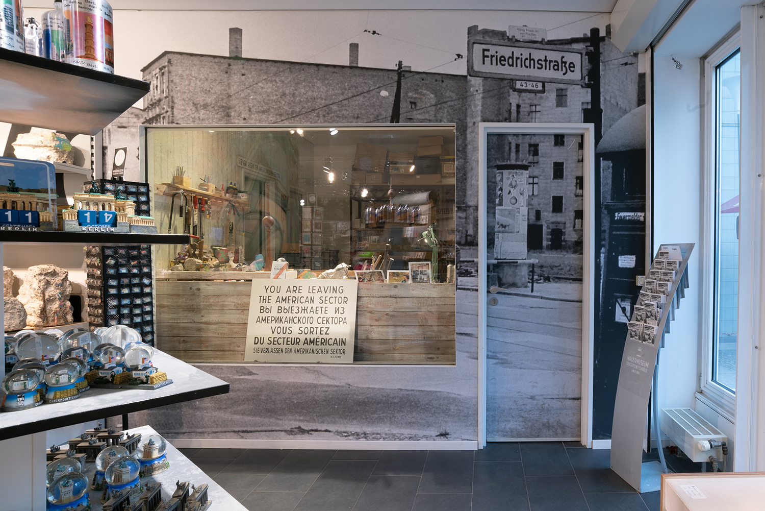 The Wall Museum at Checkpoint Charlie shows and tells through various documents, historical photos, objects etc. the history of the Berlin Wall from 1961 to 1989. Various themes were designed for the Wall Museum, which were implemented in different products. On the basis of the well-known warning sign was developed an alphabet, which as used like leitmotif for the interior design of the shops and the café, together with some historical photos of the border area.